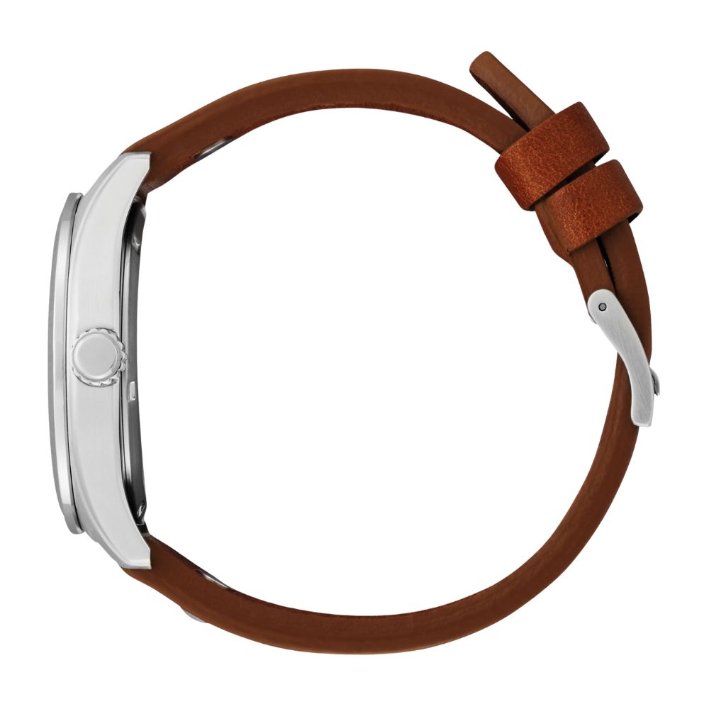 Soar to new heights wearing this vintage-inspired Disney Mickey Mouse Aviator timepiece from CITIZEN. Classic details include a tan leather strap with ivory topstitch and rivets. A stainless steel case encloses an ivory dial with exclusive artwork of Mickey Mouse flying a vintage airplane, with the propeller as the sub second hand, designed by Disney Imagineer Jeff Shelly. Citizen watches are powered by any light with Eco-Drive technology, and never need a battery. ©Disney